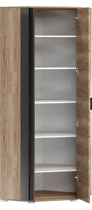 Угловой шкаф состоит из трех отдельных: одностворчатого, двустворчатого и углового. Три двери зеркальные, а одна — глухая. В комплект к корпусам идут ручки, карниз и 4 штанги для одежды. Продуманное наполнение шкафов поможет компактно и удобно расположить одежду.